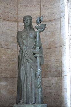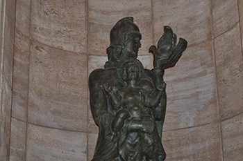 En las galerías laterales se encuentran esculturas que representan a la Gran Patria Americana en sus cuatro etapas: América Indígena, América Colonial, América Constitucional y América Futura.