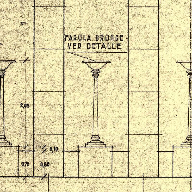 Las columnatas del Propileo circunscriben una amplia nave, aproximadamente de 40m de longitud, ambiente abierto, con una decoración exterior de obras ornamentales de broncería artlstica: dos urnas reflectoras de gran tamaño se hallan en los extremos de cada uno de los frentes. Dos urnas de menores dimensiones sobre cada uno de los costados configuran un total de ocho urnas de bronce patinadas en color verde pompeyano, semejante al de las estatuas.