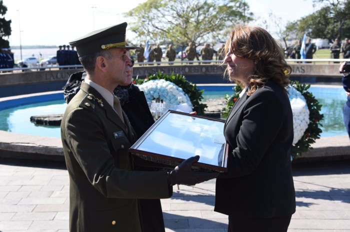 Tras una invocación religiosa, familiares del Tte. Vázquez entregaron a la intendente, en representación al municipio, el sable del uniforme de gala para su custodia en la Galería de Honor de las Banderas en el Monumento.