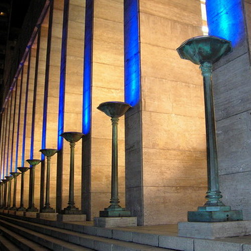 Las columnatas del Propileo circunscriben una amplia nave, aproximadamente de 40m de longitud, ambiente abierto, con una decoración exterior de obras ornamentales de broncería artlstica: dos urnas reflectoras de gran tamaño se hallan en los extremos de cada uno de los frentes. Dos urnas de menores dimensiones sobre cada uno de los costados configuran un total de ocho urnas de bronce patinadas en color verde pompeyano, semejante al de las estatuas.