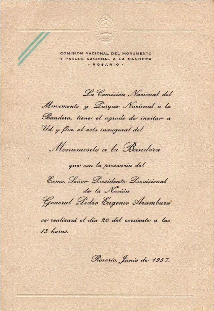 Después de 14 años, el 20 de junio de 1957, se inaugura oficialmente el Monumento Nacional a la Bandera, en un actos encabezado por el Presidente de la nación Gral. Pedro E. Aramburu.