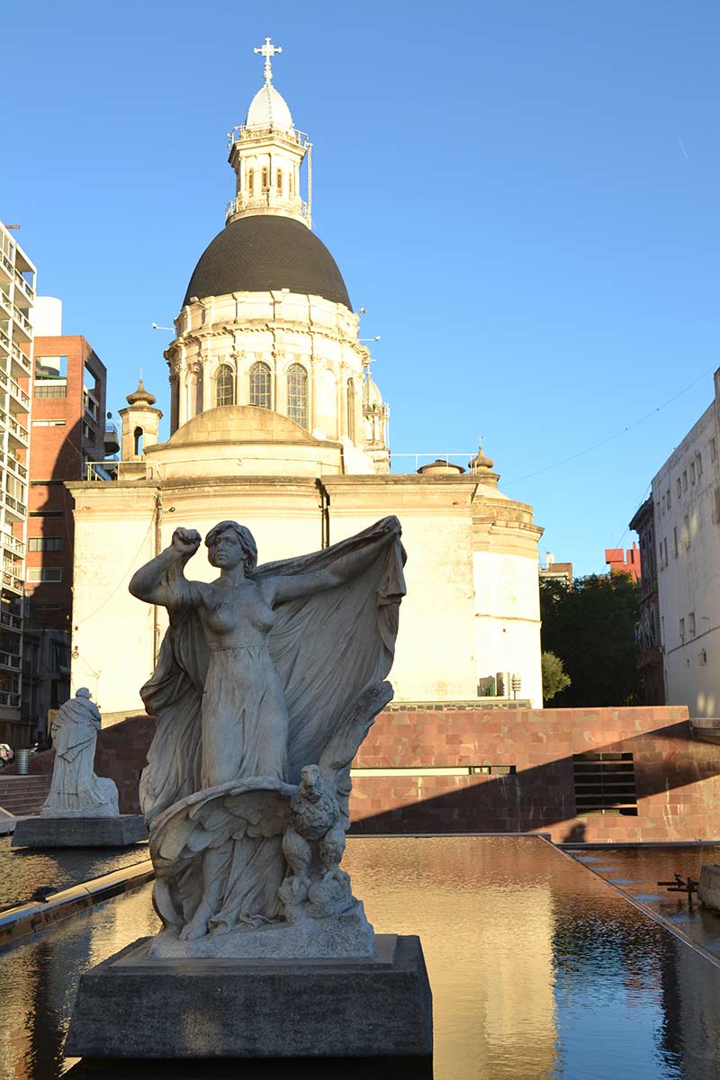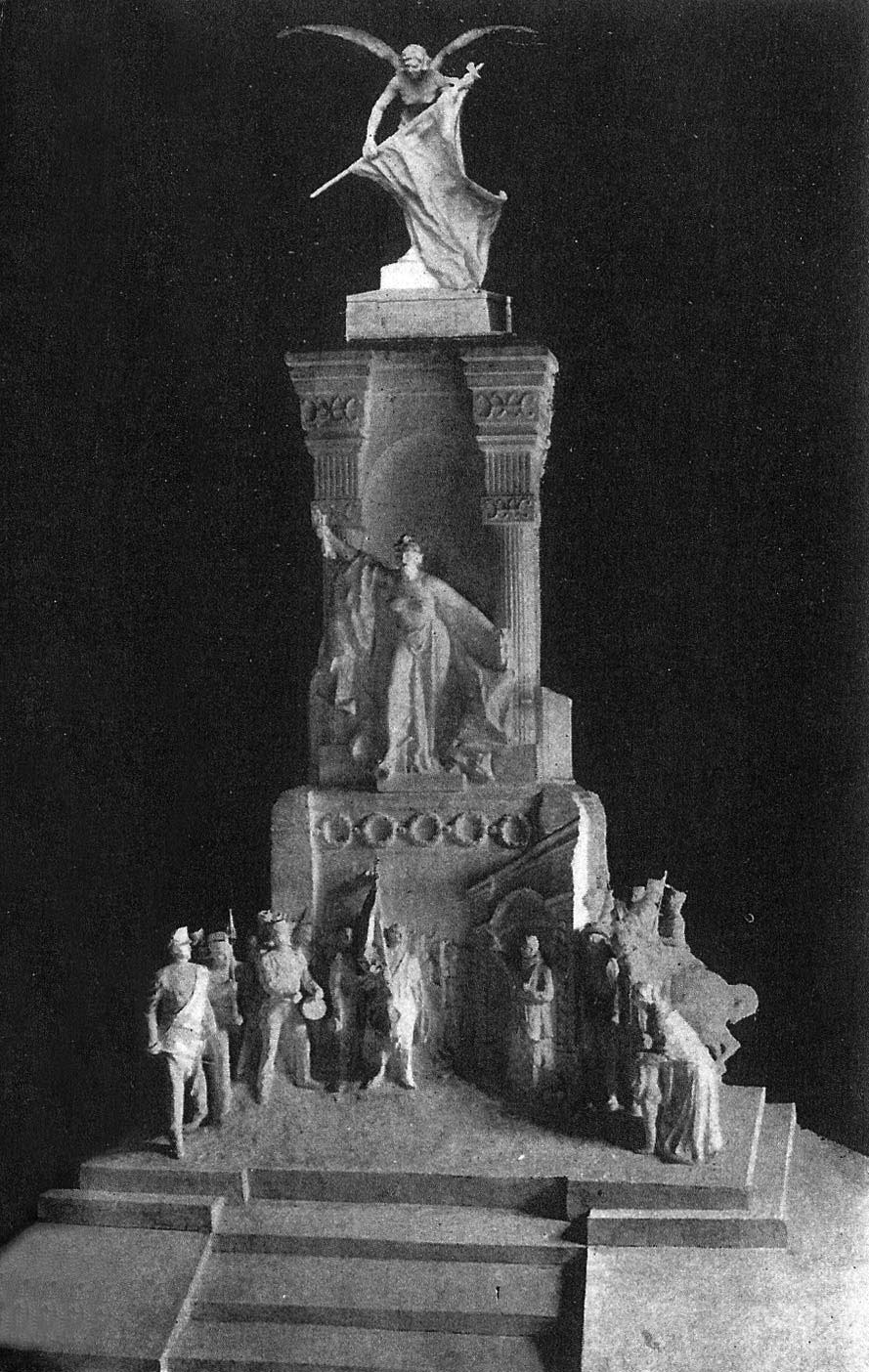 En 1909 la Comisión del Centenario contrató a Lola Mora, para realizar el ansiado monumento en el marco de los festejos en conmemoración de los cien años de la Revolución de Mayo. El mismo consistía en un conjunto de 18 metros de altura en total. En el sector bajo se desplegaban escenas históricas: la bendición de la Bandera, escenas de combate y la aclamación de la Bandera por el pueblo y el ejército. En la parte intermedia aparecía una figura femenina rompiendo las cadenas. En la parte superior se personificaba a una mujer con alas desplegadas que representaba al "Espíritu de la Patria”, portando en sus manos la Bandera Nacional. El monumento debía estar concluido para 1911, sin embargo debido a incumplimientos en el pago del contrato se retrasó la obra. Los conflictos van a seguir hasta 1925 cuando la Comisión Pro-Monumento a la Bandera solicitó la rescisión del contrato, promoviendo la realización de uno nuevo.